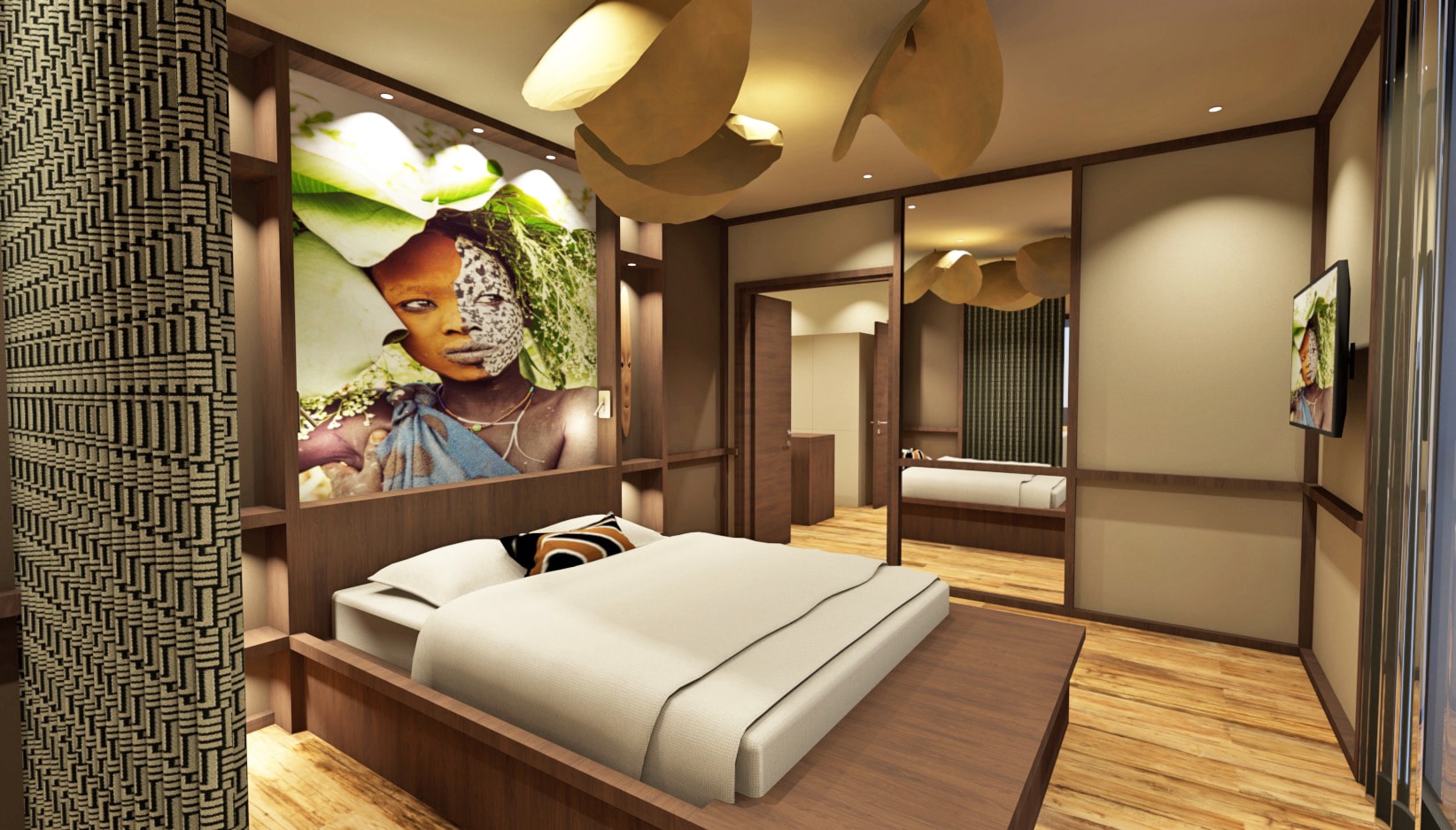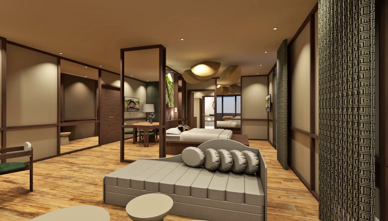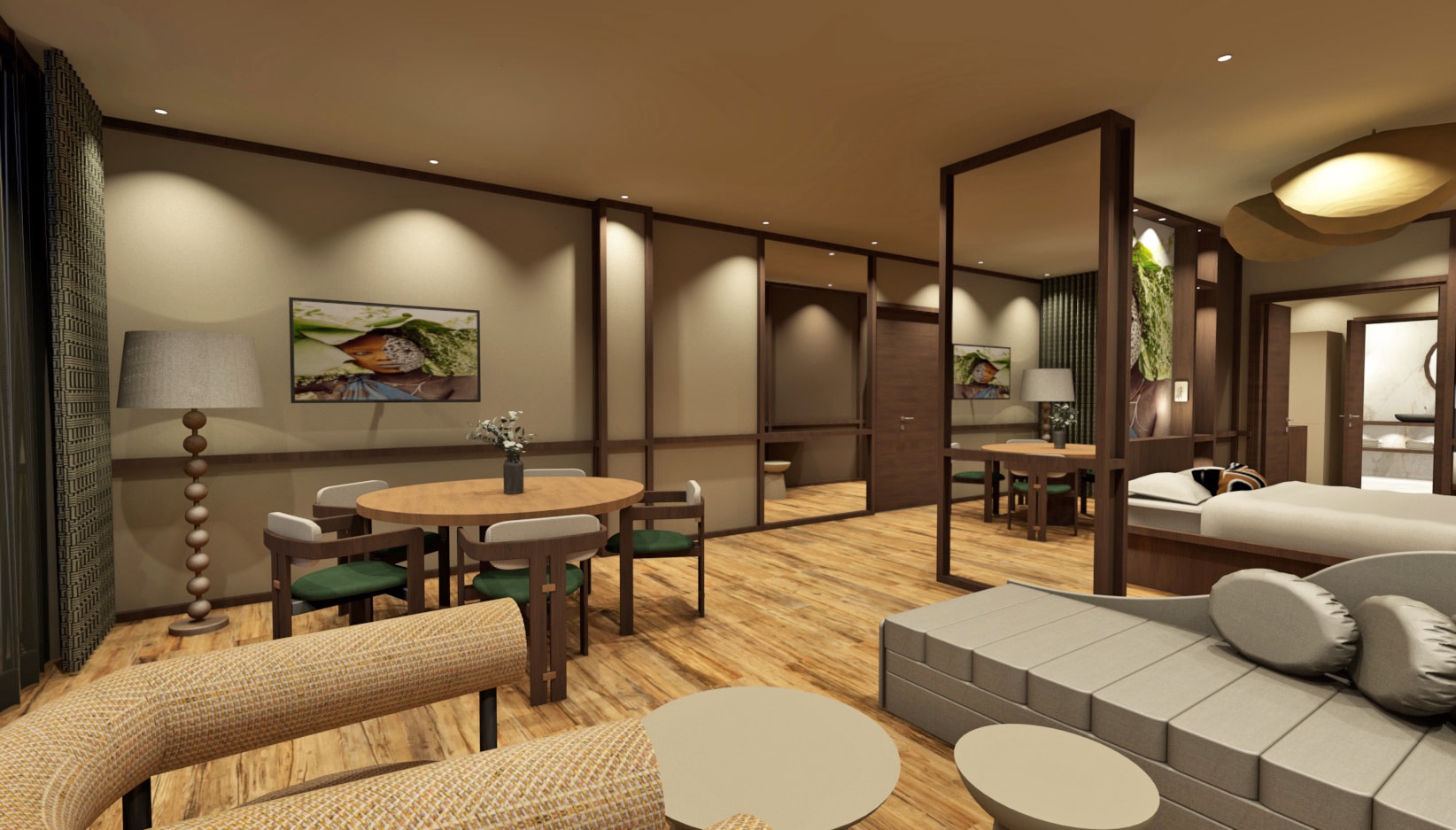 The Kòló Deluxe Suite offers a truly residential experience. With its distinct spaces - bedroom, living room and dining room - it preserves the privacy of each individual while enjoying moments of conviviality. Generous volumes, from 65 to 121 m² depending on configuration, create an airy, soothing atmosphere. A place designed to make the most of your stay in Yaoundé, whether as a family or for an extended business trip.Equipment and services